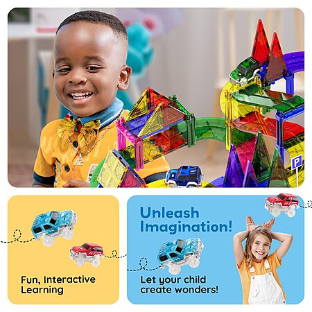 $54.99*:PicassoTiles 128pcs Magnetic Race Car Track Building Block Educational Toy Set Tiles Magnet Playset 3 LED Car STEM Learning Construction Kit