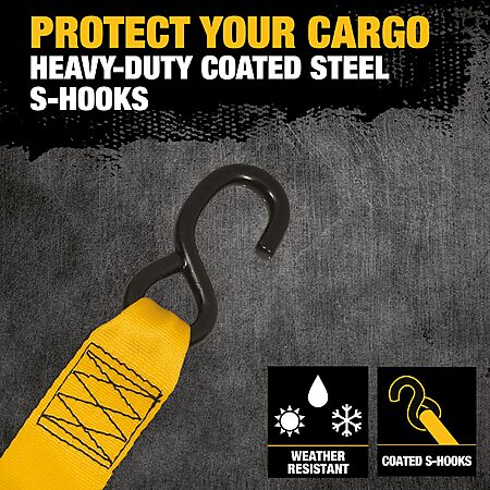 - Highly visible, weather- and wear-resistant straps meet WSTDA standards and always threaded for instant use. Coated steel double J-hooks resist corrosion and grip without scratching or marring vehicles or cargo