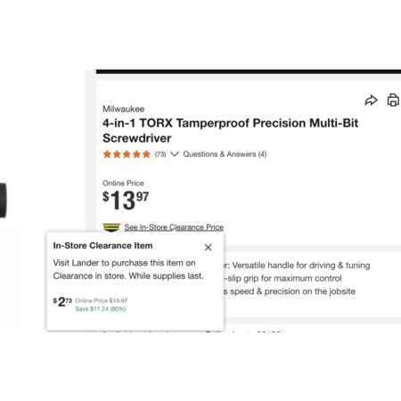 YMMV in store: Milwaukee 4-in-1 TORX Tamperproof Precision Multi-Bit Screwdriver $2.73