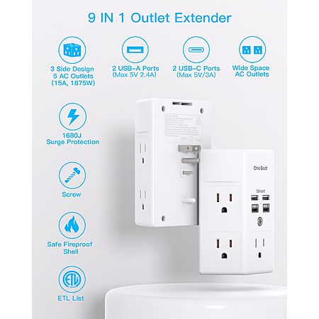 【9 in 1 Surge Protector with USB C】- The outlet extender is fit duplex outlet perfectly, just plug in to use. You will get 5 AC outlets with the wide space in between and 4 USB ports(2 USB C), the screw at the middle and the plastic prong on back for fixing duplex outlet, you don't worry about falling off. The outlet splitter can charge up to 9 electric devices at same time, is a perfect electrical equipment for your different needs.