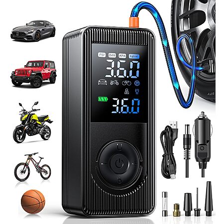 - 【Smart Control – Real-Time Pressure & Auto Shutoff】Take the guesswork out of inflation. This air pump for car tires includes an LCD screen and automatic shutoff to hit the exact PSI without overfilling. Intuitive and efficient, it's the air compressor portable that beginners and pros alike can trust.