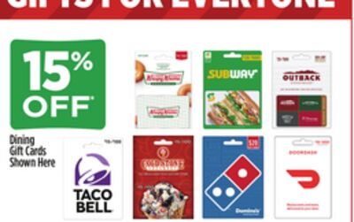 Dollar General in store, 11/30-12;6, 15% off select dining gift cards, Taco Bell, Krispy Kreme, Subway, DoorDash, Subway, Outback, Dominos, Coldstone