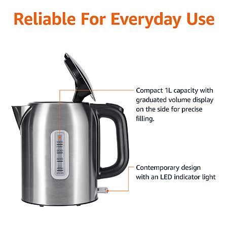 Amazon.com has Amazon Basics 1.1Qt (1L) Electric Kettle, Tea Kettle & Water Boiler, with Auto Shut-Off, Boil Dry Protection, High-Safety Strix Thermostat, BPA-Free, 1500W, Stainless Steel, New Model, Black & Silver on sale for $15.99.