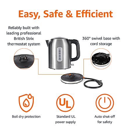 - SAFETY FEATURES: Automatic shut-off and boil-dry protection provide safe operation when you use this electric water boiler. A heat resistant handle allows safe, comfortable pouring