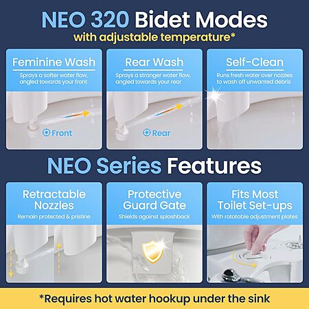 Product Details:- WARM WATER CLEANS BETTER – The NEO 320 features adjustable water temperature. The warm water offers both comfort and a better clean. Hot water is sourced from a sink connection.