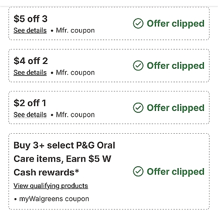 Clip the Buy 3+ select P&G Oral Care items, Earn $5 W Cash rewards coupon.