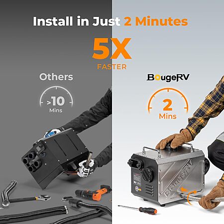 - Fast & Powerful: BougeRV all-in-one diesel RV heater equipped with 5KW of heating power, rapidly warms 307 ft³ tents in just 8 minutes, providing swift and consistent warmth for camping or working in cold conditions