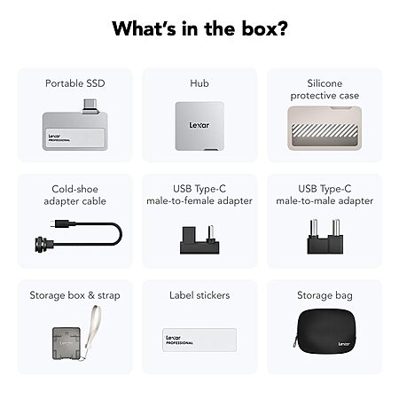 Model: Lexar 2TB Professional Go Portable SSD w/Hub, Supports Apple 4K 60fps ProRes, Up to 1050MB/s, USB 3.2 Gen 2, Rugged, IP65, Ultracompact, Compatible w/iPhone 15/16, External SSD (LSL400S002T-RNSNU)