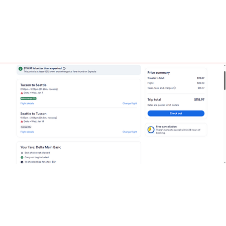 Delta Air Lines, Alaska Airlines and Expedia have round trip airfares travelling to and from Tucson AZ (TUS) and Seattle (SEA) for $119, nonstop. These are basic economy fares that allow a personal item and a carry-on bag. There is no seat selection and no change.