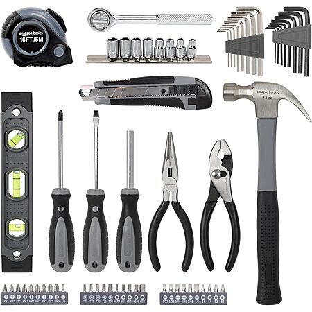Amazon Basics 65 Piece Home Basic Repair Tool Kit Set With Bag, Silver, Black