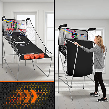 About this item- Double Shot Fun: Comes with 4 rubber basketballs, two hoops, and an electronic scoring board for competitive play.
