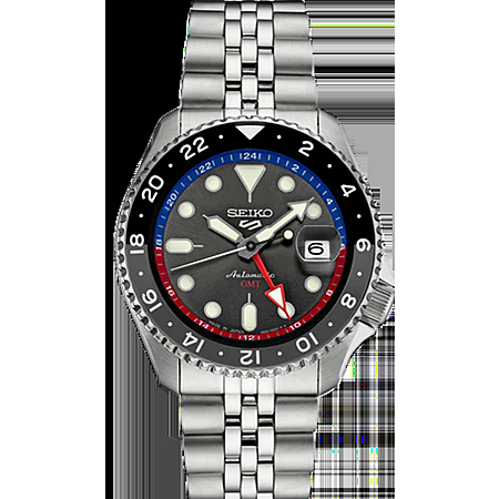 Seiko 5 Sports SKX GMT U.S. Special Creation. Adding new richness to classic sport/dress design, this stylish watch delivers all-day versatility with a cutting edge. With its GMT function and stylish five-row bracelet, this dynamic watch offers a new variation on the popular "SKX" style. Equipped with automatic technology that you control with every movement, this versatile timepiece is powered by a 24-jewel movement that beats at a frequency of 21,600 vibrations per hour, with a power reserve of approximately 41 hours and manual winding capability. Highlighting the iconic color scheme of the first Seiko 5 Sports designs, the charcoal gray dial with blue and red accents, framed by a bi-color 24-hour GMT bezel, features bold luminous hands and markers, and a magnified date calendar, as well as a large GMT hand with red accents for easy second time zone tracking. Crafted of stainless steel, with a tri-fold push button release clasp and lock, and a screwdown see-through caseback for a view of classic timekeeping in action. 10 bar, 100M Water Resistant