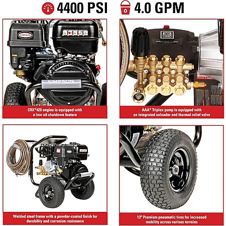 ENGINE & PUMP: CRX420 engine starts easily and includes low-oil shutdown; AAA triplex plunger pump delivers 4400 PSI at 4.0 GPM and includes integrated unloader and thermal relief to prevent overheating; Designed for reliability and long service life