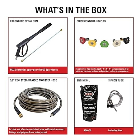 PRO PRESSURE WASHER ACCESSORIES: Five quick-connect pressure washer tips (0°, 15°, 25°, 40°, and soap nozzle) cover tasks from stripping paint to car cleaning; Rear-load M22 pressure washer gun and 31" spray wand included