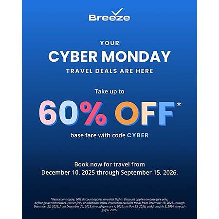*Discount applies only to new reservations for roundtrip flights when booked with promo code CYBER. *60% off discount applies to travel from December 10, 2025, through February 10, 2026. *40% off discount applies to travel from February 11, 2026, through May 12, 2026. *30% off discount applies to travel from May 13, 2026, through September 15, 2026. Supply is limited, and no advance purchase requirement applies. Promotion must be purchased at FlyBreeze.com or on the Breeze app from December 1, 2025, through December 2, 2025 (11:59 pm PT). Promotion excludes travel from December 19, 2025, through December 23, 2025; from December 26, 2025, through January 4, 2026; on May 25, 2026; and from July 3, 2026, through July 6, 2026. Travel must be flown on qualifying travel dates for discounts to be applied in full. The discount will apply only to flights on qualifying travel dates. All fare rules will apply. Certain flights and/or days of travel may be unavailable. Fare prices, fare classes, rules, routes, and schedules are subject to change or exemption without notice. Promotion cannot be combined with any other offer. Any changes or modifications to qualifying promotional reservations will be subject to fare repricing. A difference in airfare at the current fare price may apply. Offer not valid on group bookings. Other restrictions and blackout dates may apply.