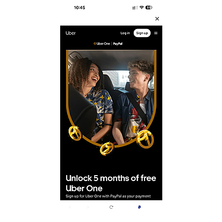 Sign up for Uber One with PayPal as your payment method to start your trial and enjoy exclusive rewards, including unlimited free delivery and cashback on your everyday rides and orders. Offer ends 2/3/26.
