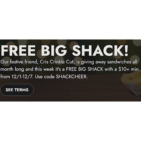 Offer only valid for qualifying orders placed at a kiosk in-Shack, or for delivery or pick-up via the Shake Shack Mobile App or shakeshack.com, and fulfilled starting on Monday, December 1st 2025 through Wednesday, December 31st 2025 ("Promotional Period"), containing the specified promotional sandwich of that day, at participating US Shake Shack locations (excluding airports, stadiums, arenas, travel plazas, and museums). Promotional sandwiches offerings are 12/1-12/7: The Big Shack, 12/8-12/14: SmokeShack (single only, excludes double and triple), 12/15-12/20: Chicken Shack (excludes Avocado Bacon Chicken and Chicken Bites), and 12/21-12/31: ShackBurger (single only, excludes double and triple). Offer not valid for drive-thru orders or orders made through third-party delivery apps. Limit one (1) free Promotional Sandwich per order. Max savings equal to the price of the Promotional Sandwich (from $8.49 - $10.99). Order total must include a minimum of $10 worth of food or beverage products (including burgers, sandwiches, fries, chicken bites, hotdogs, drinks, shakes, frozen custard, poochinis, bag o' bones), excluding the cost of the Promotional Sandwich, gift card purchases and any applicable taxes, delivery fees or other fees. Must add at least (1) applicable Promotional Sandwich to cart prior to checkout. Offer excludes all paid add-ons such as avocado and bacon. While supplies last. Cannot be combined with any other offers or promotions. Must use promotional code 'SHACKCHEER' at checkout. Code is case sensitive. Offer code will only work in all caps.