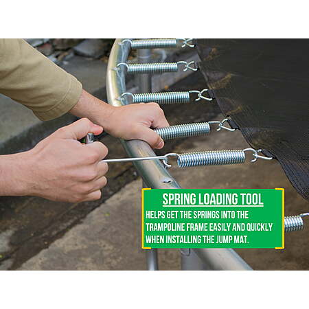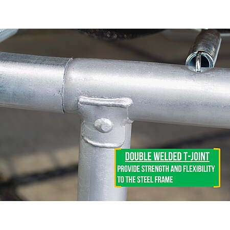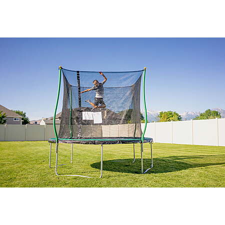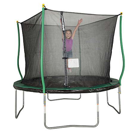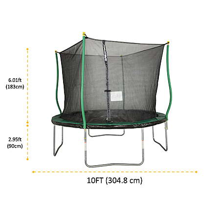 Kids will love bouncing on the Bounce Pro 10' Trampoline with interactive flash light zone. The flash light zone kit attaches easily underneath the jumping mat to the trampoline frame with bungee cords and lights up the center to help kids jump safely in the center of the jump mat. The frame and legs are made from high quality galvanized steel. The UV-resistant jump mat and springs together provide a soft, deep bouncing action. The spring pad protector, jump mat and enclosure netting are all UV-resistant and tested to more than double the ASTM recommended levels. The Bounce Pro 10' Trampoline with Flash Light Zone meets or exceeds ASTM safety standards and will provide your kids with years of safe fun. To ensure safe, responsible use, please limit to 1 jumper at a time and always have adult supervision. Bounce Pro 10' Trampoline, Flash Light Zone, Classic Safety Enclosure Rust-resistant galvanized steel frame The TenCate Permatron® jump mat withstands over 5000 hours of UV testing UV-resistant polyethylene enclosure netting to prevent falling out 6 padded poles deliver a sturdy enclosure frame Padded spring cover adds additional safety and helps prevent contact with springs Patented double welded plates leg weld to reinforce joints and prevent bending/breaking Steel 'U-leg' design for stability Spring loading tool included Impact Activated Flash Light Zone Dimension: Length 10 Ft / 304.8 cm Height 6.01 Ft / 183 cm