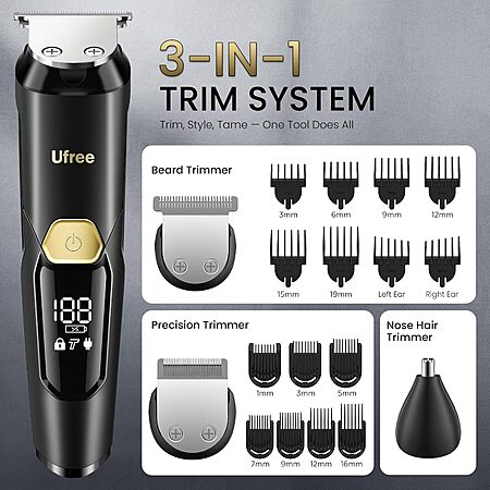 Prime Members: Ufree 3-in-1 Rechargeable Hair, Beard & Nose Hair Trimmer Kit w/ 15-Combs on sale for $18.99 - $9.50 (50%) off when you apply promo code