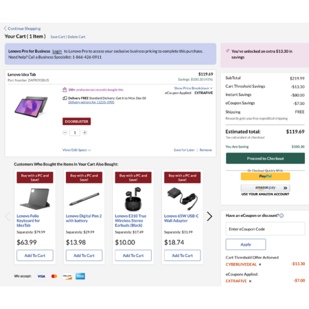 Lenovo has 128GB Lenovo Idea Tab Android Tablet (Luna Grey; ZAFR0928US) on sale for $219.99 - $80 Instant Savings - $13.30 off eCoupon CYBERLIVEDEAL - $7 off eCoupon EXTRAFIVE (apply in cart) = $119.69. Shipping is free.