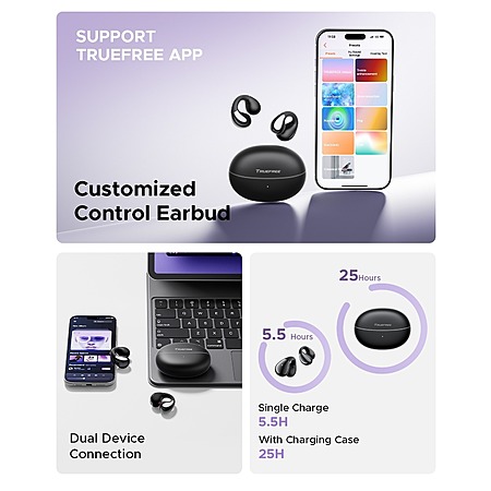Model: truefree B1 Open-Ear Wireless Earbuds, Bluetooth 5.4 Headphones with Spatial Audio, Ultra-Light Clip-On Fit, 25H Battery, Fast Charging, Multipoint Connection, App Customization, Workouts, Commute
