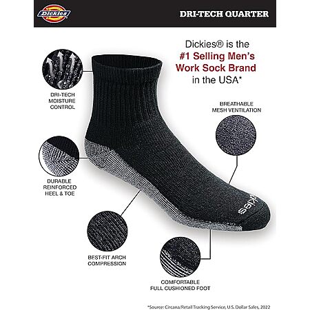 6-Pack Dickies Men's Dri-tech Moisture Control Quarter Socks, Black $7.83