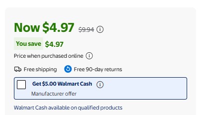 Listed at 4.97 and you can have 5 walmart cash with purchase