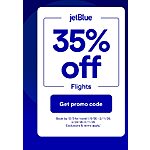 Promo code is valid until 12/3/25 (11:59 PM ET) for 35% off the base fare of a JetBlue flight for travel 1/6/26 - 2/11/26, 2/24/26-3/11/26 (Excl Fri/Sun travel). Discount applies per person and only on nonstop flights, excluding taxes and fees. . View details on government taxes and fees. Subject to availability. Code is valid for flights purchased online, new bookings only; limit one code per booking. Code is not valid in connection with JetBlue Vacations packages, Mint fares, EvenMore, transatlantic flights, award flights, Cash + Points redemption bookings, taxes/fees, partner or codeshare or interline flights including JetBlue flights when at least one segment is operated by a partner airline, baggage fees, or any other products or services. Code cannot be combined with other offers, cannot be partially redeemed, has no cash value, and is not redeemable for cash.