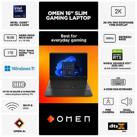 HP OMEN 16: 16" FHD+ 165Hz, Intel Ultra 5 225H, RTX 5050, 16GB DDR5, 1TB SSD $799