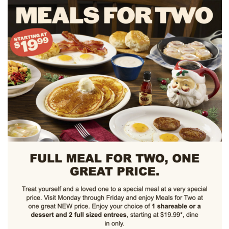 Cracker Barrel Meals for Two, Starting at $19.99! (M-F Only) $20