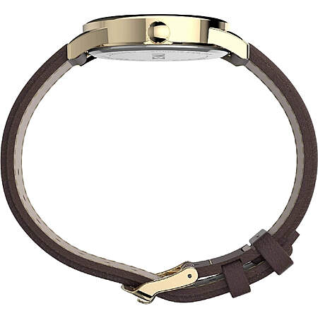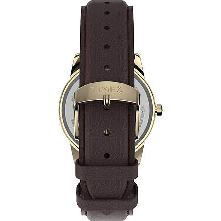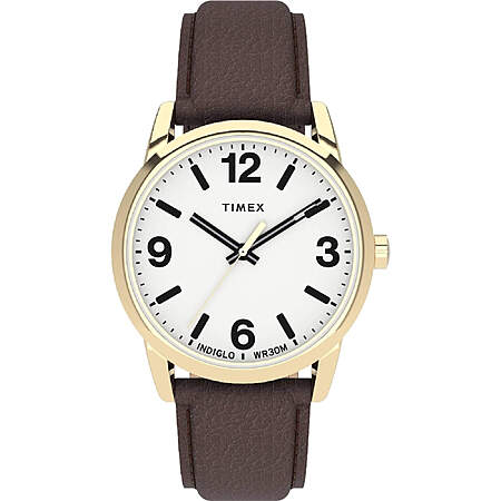 Timex TW2U71500 men's Easy Reader brown leather strap watch is offered, in a yellow gold plated brass case. This watch measures 38mm across and 9mm thick. This watch has a fixed bezel and a textured push/pull main crown. Timex TW2U71500 is equipped with a brown genuine leather strap. Securing the strap is a pin buckle clasp made in stainless steel.