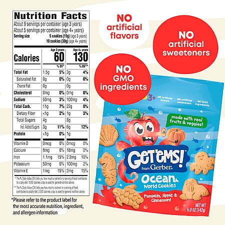 | Product Description: | Introducing Get'ems! from Gerber Pumpkin, Apple & Cinnamon Ocean World Cookies, the tasty cookie that's designed to make snack time both delicious and nutritious. Dive into a sea of yummy goodness with our delightful marine friends, bringing a splash of tasty nutrition in every crunch. Crafted by the nutrition and quality experts at Gerber, these kids snacks are baked with real veggies and fruits and are a great lunch box option. Each bite not only excites their taste buds but also provides essential nutrients like iron, which supports brain development, and Vitamin E. We believe in providing only the best for your little ones, which is why our cookies contain no artificial flavors or artificial sweeteners, no artificial preservatives, and no GMO ingredients. Who says nutrition can't be fun? Get'ems! from Gerber adds excitement to snack time with our ocean-themed cookies that come in the shape of friendly marine animals. Contains allergens: WHEAT. Dive into a sea of yummy goodness: baked with real veggies and fruits, our Get'ems! from Gerber pumpkin, apple & cinnamon ocean world cookies and their friendly marine shapes offer a splash of tasty nutrition with every crunch Iron and vitamin e: each ocean world cookie provides iron to support brain development and essential vitamin e. these are not just any kids snacks; they are a nutritious choice for your child Quality ingredients: our kid’s cookies for ages three and up are crafted with no artificial flavors, no artificial sweeteners, no artificial preservatives, and no gmo ingredients Make nutrition fun: who says nutrition can't be fun? Get'ems! is on a quest to help kids discover a whimsical new world of nutritious foods and delightful flavors that light up every child’s face with a big smile Lunch box ready: these kid’s snacks from Gerber are designed by nutrition and quality experts to offer a delightful crunch. perfect for kid snack times, our ocean world cookies make food both fun and nutritious |