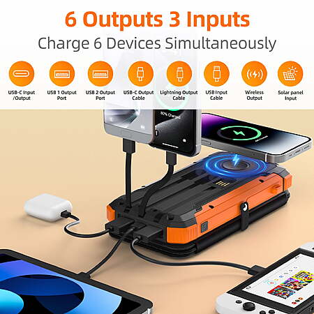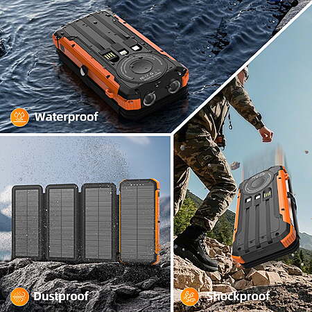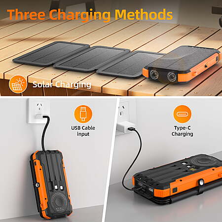| Product Description: | The 20000mAh solar power bank features 4 solar panels (6W total), serving as a reliable solar charger.It supports 22.5W fast charging and wireless fast charger, and comes with built-in 3 cables. As a versatile solar phone charger, it is compatible for iPhone, Android, Samsung series, etc. This solar portable charger is also IPX4 waterproof, temperature-resistant, and includes an SOS flashlight, making it ideal for outdoor and emergency use. Massive 20000mAh Capacity Power Bank:This solar power bank has 20000mAh high-capacity battery that can Fully charge an iPhone 15 (4-5 times),Power a Samsung Galaxy S23 (3-4 full charges),Give your iPad mini 1-2 full charges,Perfect for multi-day trips, camping, or emergencies when outlets aren't available. 18W Power Bank Fast Charging & Multiple Power Options:Charge devices FAST with 18W USB-A output (orange port),built-in 3 cables:(USB-C (5V/3A), Lightning (5V/2A), Micro USB (5V/2A) )and Wireless charger(5w(Max))- not only does it eliminate the need for additional cables, but it can also charge at the same time. 4 Solar Panels + Ultra-Portable Design: 6W solar input (4 300mA panels) - Fully charged requires 12-15 hours of sunlight exposure (ideal backup power for outdoor use), this foldable solar charger power bank can be folded into a compact size (6.29*3.34*0.79 inches), which can be easily put into a backpack, and it is also equipped with a hook, which can be hung on the backpack and charged while walking. Super-Bright LED Flashlight:This Battery Pack With dual LED flashlights that illuminate the road up to 15 meters away and an SOS strobe mode (press and hold the button to activate an emergency signal), this portable phone charger is a must-have for camping, power outages, emergencies, or nighttime adventures. Designed for outdoor activities: This portable charger is designed for adventure, shockproof, weatherproof (IPX4), rainproof and splashproof, and extreme temperature ready (-10°C to 45°C) - can be used in the desert or snow. In addition, this portable charger has intelligent safety features (overcharge/short circuit/overheating protection) to ensure your charging safety. Emergency function: When extreme disasters such as hurricanes and fires cause power outages, this solar charger can use sunlight to continuously charge electronic devices, ensuring communication and power needs in emergencies, helping you respond to crises safely. |