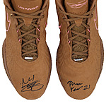 LeBron James Autographed Los Angeles Lakers Game-Used Brown Nike Shoes vs. Philadelphia 76ers with "Prime Year 21" Inscription $69999.99