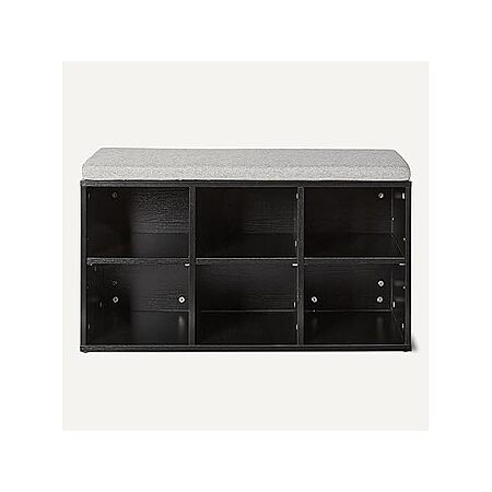 - Shoe storage bench in Black with 6 cubbies for storing 6 pairs of shoes; soft, non-slip cushion for comfortable sitting
