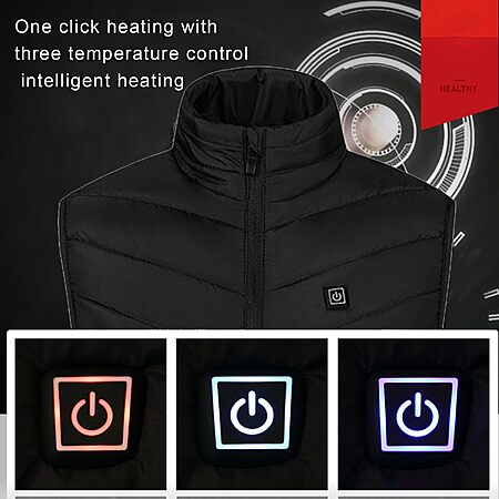 3 Temperature Control: This heated jacket has three heating control that temperatures from 25 to 45 °C. High temperature = red, medium temperature = green, low temperature = blue. This heated coat contains 8 Heating Zones & Usb-Rechargeable (NOTE: The power supply is not included)
