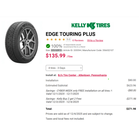 4 Tires installed ~$271.98 +Tax Kelly Edge Touring Plus many sizes at BJ's 205/60R16 and more