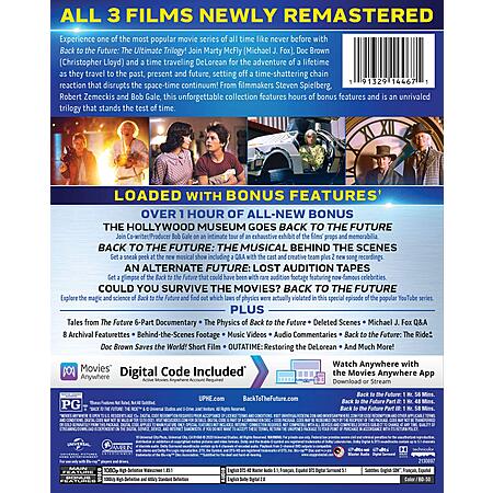 About this trilogy: - Experience one of the most popular movie series of all time like never before with Back to the Future: The Ultimate Trilogy! Join Marty McFly (Michael J. Fox), Doc Brown (Christopher Lloyd) and a time traveling DeLorean for the adventure of a lifetime as they travel to the past, present and future, setting off a time-shattering chain reaction that disrupts the space-time continuum! From filmmakers Steven Spielberg, Robert Zemeckis and Bob Gale, this unforgettable collection features hours of bonus features and is an unrivaled trilogy that stands the test of time.