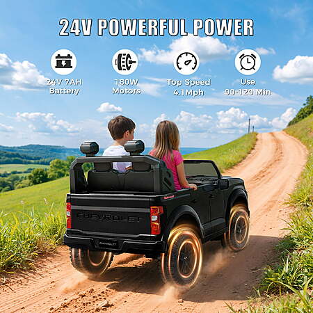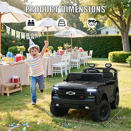 Officially licensed Chevrolet Silverado 24V Ride On Car Toy Collection - the perfect blend of luxury and fun for your child! This 2 seat ride on car is designed for children ages 3 to 8 and comes equipped with 24V 7Ah battery powered, dual motors, 4 wheel suspension, a music player with volume control and Bluetooth, a seat with a seat belt, and a searchlight. Safety is our top priority, which is why we've included a new generation of 2.4G remote controls that allow parents to stop the car from a safe distance in case of potential hazards. Our kids ride on toy is not only durable but also comes with a range of features that will keep your child entertained for hours. From opening the door and jumping in to buckling up and turning on the car, your child will feel like they're driving a real car! We believe that good remote control ride on toys should not only be fun to play with but also help bring families together. That's why we're committed to creating toys that children love and parents trust. Upgrade your child's playtime experience with the officially licensed Chevrolet Silverado Ride On Car today! 24 volt ride on toys for big kids! Features Licensed Chevrolet Silverado 2 powerful 90W motors 24V 7AH battery lasts for a long time Electric pedal control and 2.4G remote control 2 seats with 3-point seat belts Power display and battery display Realistic mirrors, lockable doors, a steering wheel, and pedals MP3 player/volume adjustment/music effect One-button start, forward and backward, fast and low speed Luxurious front LED lights, Strong and durable plastic wheels, four-wheel shock absorption Manual mode 2 speed; Remote mode 3 speed Specifications - Item Name: Licensed Chevrolet Silverado 24V Ride on Car 2 Seat - Color: Black/Blue/Pink/White - Battery: 24V7Ah - Motor: 90W*2 - Power: 2WD - Charger: UL - Test standards: MSDS, CPC - Applicable age: 3-8 years old Boys Girls - Maximum Load: 130 lbs is the maximum weight for 2 riders(combined) - Products Dimension 44.09"L* 29.52" W * 28.35"H - Product Weight: 46.29 lbs - Speed: 24V MAX 4.04 mph - Play Time: 1-2 hours -Recharger time 8-12 hours Products Include - 1 x 24V Ride ons - 1 x 2.4G Remote Control - 1 x Charger - 1 x Manua Note Children under 3 need to be used under adult supervision. The remote control should be operated by an adult, not a child. Long-press the button on the remote to pair the remote control with the car before using remote control mode. Please kindly check the product size before purchase, as some children grow faster REALISTIC FUNCTIONS - Officially Licensed Chevrolet Silverado 24V 2 Seater Kids Ride On Car Toy Series. Equipped with two seats, USB, MP3, 4 wheel absorber, LED Headlights, Bluetooth music player, volume adjustment, power display, and light, it provides your children with real experience. Children will gain more autonomy and entertainment while playing. SAFE & COMFORTABLE DRIVING EXPERIENCE - This remote control cars ride on for kids has a smooth and comfortable drive with wide tires, seat belts, Spring Suspens and lockable doors designed for maximum safety while your child is riding. The Chevrolet Silverado 24V kids electric car truck starts at low speed, giving your child plenty of time to react to any situation. CHILD DRIVEN and REMOTE CONTROL - A child can drive the kids cars to ride in, commanding the steering like a real car. Want to build up to them driving? You can easily take control of the toy with the included remote control to safely guide it. The remote control is equipped with forward/reverse/park controls, steering operations, and 3-speed selection. EASY TO ASSEMBLY - The Chevrolet Silverado 24V Powered Ride On Truck assembly is straightforward according to the detailed instructions. This rational design battery powered riding toys is a perfect gift for your child or grandchild for a birthday gift, a christmas gift, or a New Year gift. Please kindly check the product size before purchase, as some children grow faster. TOP SERVICE - KEESI Shop provides professional customer service both before and after your purchase. If you have any questions about our unisex toddlers ride on car, feel free to contact us. Our professional customer service team will provide you with solutions within 24 hours. (Customer Service Email: