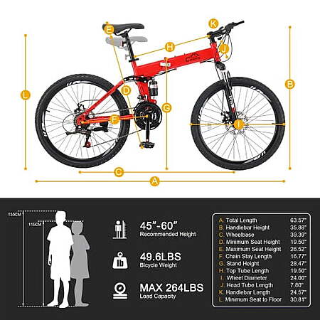 | Product Description: | ▶【DURABLE STEEL FRAME】 Built with a 24-inch sturdy and durable steel frame, this mountain bike provides a safe and stable cycling experience. Ergonomically designed for children aldults between 45-60 inches tall, it can support a maximum weight of up to 220 lbs. ▶【SHIMANO 21-SPEED WITH DISC BRAKES】 Equipped with trigger shifters for smooth gear switching, this man bike allows for quick gear selection suitable for various terrains. Precision mechanical disc brakes offer more precise and controlled braking, providing better performance than V brakes. ▶【FRONT FORK + SHOCK ABSORBER】 Featuring shock-absorbing front and rear shock absorbers, this all-terrain mountain bike ensures a smooth and comfortable ride. The dual shock absorbers provide an enhanced cushioning effect for a bump-free experience. ▶【ALL-TERRAIN TIRES】 Fitted with 24x2.1" all-terrain tires made of high-quality rubber, these wheels offer strong puncture resistance and excellent grip. They are designed to handle dirt, trails, gravel, and paved paths, ensuring a smooth, stable ride with superior anti-skid functionality. ▶【FOLDABILITY & ADJUSTABILITY】 This foldable bike includes a quick-release clamp that enables rapid folding, making it easy to store in small spaces or transport in your car trunk. Additionally, the adjustable seat post clamp allows for easy height adjustments to fit the rider perfectly. ▶【85% PRE-ASSEMBLED】 85% of the 24in bike is already assembled. You will need to install the pedals, handlebars, saddle, front wheel, and inflate the tires. These tasks will take about 20 minutes. We will provide a bicycle manual and assembly video. If the manual is lost, please contact us for an electronic manual. Specifications: 1. Transmission Gear: 21 Speeds (3 In The Front And 7 In The Rear) 2. Handlebar: Mountain Bike Handlebar, High Carbon Steel, Sand Black, 620mm 3. Stem: Aluminum Alloy Stem 4. Front And Rear Brakes: Mechanical Disc Brakes, Aluminum Alloy 5. Roulette: High Carbon Steel Roulette 24t*34*42t 6. Shifting Lever: Shimano Tx30 Shifting Lever 7. Front And Rear Derailleurs: Shimano Tz500 Front And Rear Reflectors 8. Front And Rear Hubs: Iron Hub 36h 9. Chain: Tec Chain 10. Pedals: Plastic Pedals 11. Saddle: Mountain Bike Saddle PUV+PU+PP 12. Saddle Tube: High Carbon Steel 28.6*300mm 13. Quick Release: Aluminum Alloy Quick Release 14. Car Ladder: High Carbon Steel Car Ladder 15. Tires: Kirin Tires 【EFFORTLESS SHIMANO 21-SPEED SHIFTING】 Equipped with a Shimano 21-speed drivetrain, including 3 chain wheels and 7 cassettes, this folding mountain bike offers versatile options for different terrains. Precision shifting in the front and rear chainstay ensures a seamless and smooth riding experience, adapting to various conditions. 【DOUBLE DISC BRAKE SYSTEM】 Equipped with a double-kill disc brake system, this bike offers more stable and reliable braking performance. The precision mechanical disc brakes provide greater control and safety compared to traditional V brakes. 【THICKENED SHOCK-ABSORBING FRONT FORK】 The thickened shock-absorbing front fork effectively reduces vibrations and absorbs shocks, ensuring a smoother and more comfortable ride even on bumpy surfaces. 【FOLDABLE, LIGHT, AND PORTABLE】 This foldable bike is designed to be lightweight and portable, making it easy to carry and store. The quick-release clamp allows for quick folding, perfect for storing in small spaces or transporting in a car trunk. 【COMFORTABLY COPE WITH VARIOUS ROAD SECTIONS】 Designed to comfortably cope with various road sections, this bike has a good shock-absorbing effect. It handles different terrains with ease, providing a smooth and stable ride. |