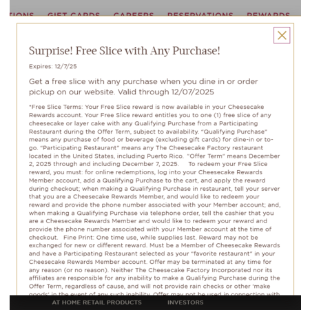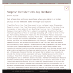 Cheesecake Factory Reward Members - Free slice with any purchase dine in or online order - YMMV