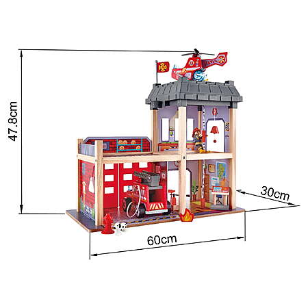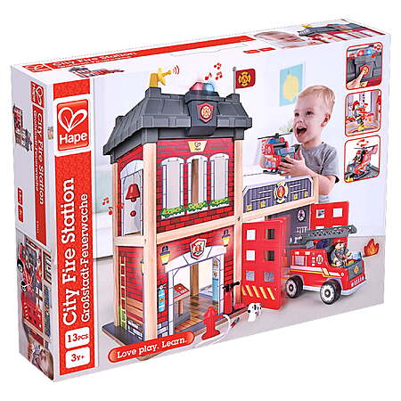 | Product Description: | HAPE CITY FIRE STATION PLAYSET - Get ready for rescue adventures with the Hape Dollhouse Fire Station! This feature-packed station is beautifully crafted in wood, with realistic Industrial details to bring your stories to life. Levels Of Fun! Explore 3 levels of fun, from the rooftop helipad to the garage with working doors. The Hape Fire Station comes with a wooden helicopter and a fire engine for storytelling adventures. Lift off from the helipad or pull the string to launch the engine from the garage and race to the rescue. Ring the alarm bell and send the firefighter whizzing down the pole from the rec room to the office. Lights and fire bell sounds bring the firefighting fun to life. There is even a flame-shaped piece kids can pretend to put out with the fire extinguisher or the fire engine's hose. A rescue dog, bed, desk, stool and treadmill add to the roleplay possibilities, so little ones can play out a whole day in the life of the firefighter. The Hape Fire Station comes with a fire engine, helicopter, figures and accessories crafted from durable wood, making it a beautiful addition to any playroom. This wooden fire station features natural textures and bright colors designed to stimulate your little one's senses. With Hape Toys, you can trust that all materials are non- toxic, child safe, and of the highest quality. Product Height 18.82 inches. CLANG-CLANG-CLANG! The alarm is ringing and flashing - there is a fire to put out. The sound/light effect controlled by a button (battery operated), adds more fun to this dollhouse playset and realism to play the scenarios. MULTI-LEVEL fire station and fire engine. Accessories include axe, fire extinguisher, helicopter, flame, fire hydrant, radar dish, flag and control board LIGHT & SOUNDS: Includes push-button fire bell and light. 2xAAA batteries required and not included. Helps children to learn about fire safety. INTERACTIVE: Pull the string, the fire engine will rush out of the garage, to the fire scene and save the day. Kids will have more hours of fun playing with this wooden toy! FIREFIGHTER comes with bendable feet and arms. Make him fit inside the truck or the helicopter. Everything your firefighter will need to save lives is ready, an ax, helicopter, fire hydrant, flag and control board! Product Height 18.82 inches, Industrial |