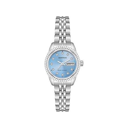 - Light blue sunray dial with day/date calendar window; silver-tone luminous hands and genuine crystal markers; black outer minute track