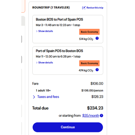 United Airlines have round trip airfares travelling from Boston (BOS) to Port of Spain, Trinidad & Tobago (POS) for $235, making 1 stop. Stopover airport and duration depends on the flight you choose. These are basic economy fares that only allow a personal item. There is no seat selection, no carry-on bag and no change. If you are travelling with children, you will be seated together as per their policy.
