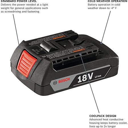 Model: BOSCH GXS18V-23B21 Starter Kit with (2) 18V 1.5 Ah Slimpack Batteries and (1) 18V Standard Battery Charger