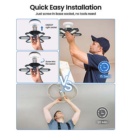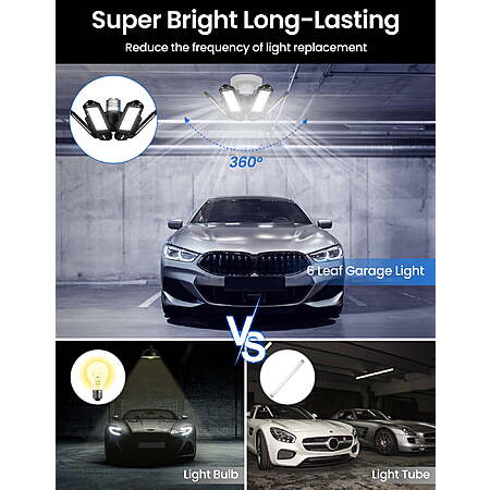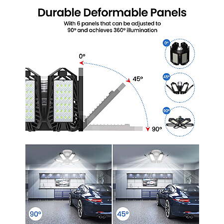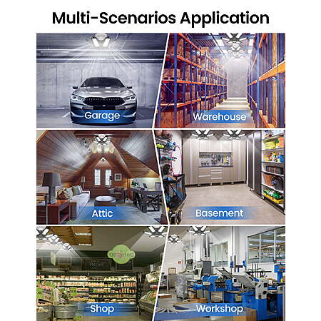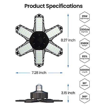 | Product Description: | Illuminate your space with unparalleled brilliance. Our Ultra Bright Garage Light delivers an astounding 2200 lumens, bathing your surroundings in 360° of clear, 6500K daylight. With a Color Rendering Index (CRI) surpassing 80Ra, it ensures true-to-life colors. This is the ultimate solution for optimal indoor lighting. Discover the future of garage lighting with our 6 Newest Garage Lights. Featuring adjustable panels that pivot from 0 to 90 degrees, they eliminate every shadow and blind spot, providing a seamless, dizziness-free lighting experience. Outshining 3, 4, and 5 panel alternatives, these lights redefine what's possible. Safety meets efficiency with our upgraded Garage Lighting Bulb. Crafted from premium aluminum for superior heat dissipation, each panel boasts a unique hollow-out design, extending its lifespan to over 50000 hours. Equating to the output of 6 traditional bulbs, it's an energy-saving powerhouse, cutting consumption by over 85%. Installation is a breeze. Compatible with E26/E27 sockets, it's as simple as screwing in a light bulb. No tools, wiring, or electricians required. In just 30 seconds, you'll revolutionize your lighting. These are the shop lights you've been waiting for. Key Features: Unmatched Brightness: 2200 lumens for 360° super bright illumination, equivalent to 29W traditional lighting. Flexible Illumination: Six deformable panels, adjustable from 0 to 90 degrees, eliminating blind spots and dizziness. Premium Build for Durability: High-quality aluminum heatsink with unique hollow-out design for efficient heat dissipation, extending lifespan to 50000+ hours. Energy Efficiency: Replaces 6 traditional bulbs while consuming over 85% less energy, making it an eco-conscious choice. Effortless Installation: Fits standard E26/E27 sockets, installable in 30 seconds without the need for tools or professional assistance. Versatile Application: Ideal for large area lighting in garages, barns, stadiums, warehouses, offices, workshops, and more. Elevate your commercial and indoor lighting game. Unmatched Brightness: 2200 lumens for 360° super bright illumination, equivalent to 29W traditional lighting. Flexible Illumination: Six deformable panels, adjustable from 0 to 90 degrees, eliminating blind spots and dizziness. Premium Build for Durability: High-quality aluminum heatsink with unique hollow-out design for efficient heat dissipation, extending lifespan to 50000+ hours. Energy Efficiency: Replaces 6 traditional bulbs while consuming over 85% less energy, making it an eco-conscious choice. Effortless Installation: Fits standard E26/E27 sockets, installable in 30 seconds without the need for tools or professional assistance. Versatile Application: Ideal for large area lighting in garages, barns, stadiums, warehouses, offices, workshops, and more. Elevate your commercial and indoor lighting game. Specifications: Material: ABS+PC Rated Operating Voltage: 100-265V Bulbs: 144 pieces of 2835 3V/0.2W each Blades: 6 in total Power: 29W Color Temperature: 6500K Driver Type: Non-isolated constant current driver Light Angle: 360 degrees, providing illumination for an area of 15-20 square meters Luminous Flux: 2200LM Dimensions: 21*21cm Compatible Base: E26, E27 Material: ABS+PC Rated Operating Voltage: 100-265V Bulbs: 144 pieces of 2835 3V/0.2W each Blades: 6 in total Power: 29W Color Temperature: 6500K Driver Type: Non-isolated constant current driver Light Angle: 360 degrees, providing illumination for an area of 15-20 square meters Luminous Flux: 2200LM Dimensions: 21*21cm Compatible Base: E26, E27 |