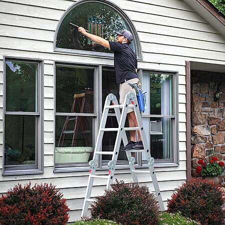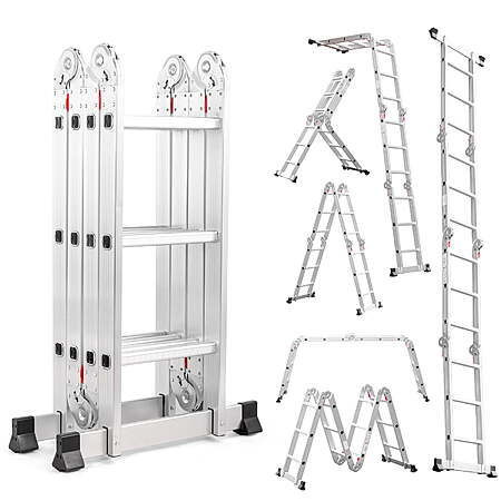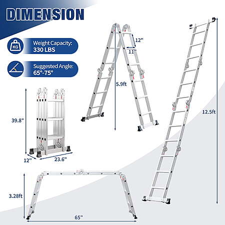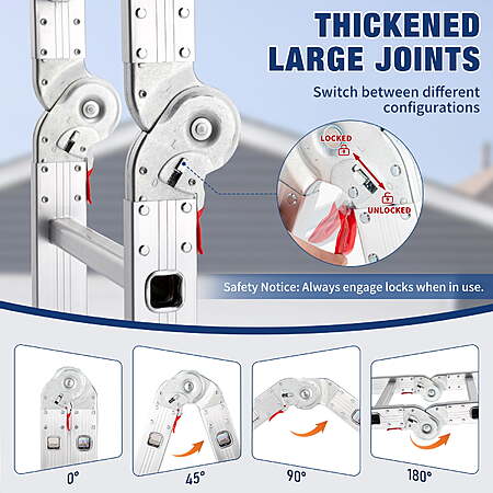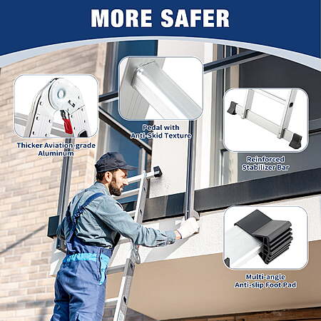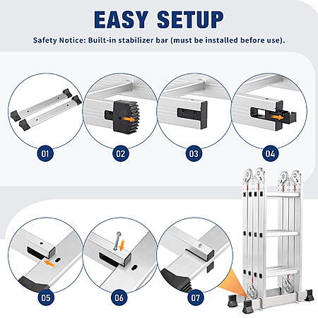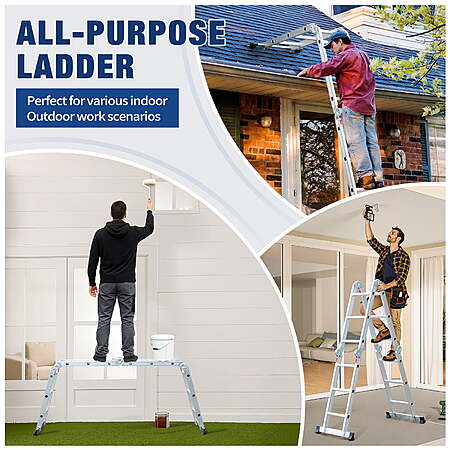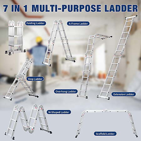 | Product Description: | The 7-in-1 Multi-Position Aluminum Scaffold Ladder delivers professional performance for both residential and commercial use. Engineered with aviation-grade aluminum alloy (25+5mm reinforced construction), this EN131-certified ladder supports up to 330lbs across all seven configurations - including A-frame, extension ladder, scaffolding platform, stairway mode, and more. No more needing multiple ladders for different jobs - our Click & Lock system with six security points engages at multiple angles (0°/45°/90°/180°), while the enhanced stability system combines zigzag foot straps, anti-slip rubber pads, and textured rung surfaces to prevent slipping. The included stabilizer bar increases ground contact by 40% compared to standard ladders, making it ideal for roof repairs, warehouse work, painting projects, and home maintenance. When not in use, it folds down to a compact 12" width for convenient storage in garages or work vans. Remember to always verify locks are in "L" position before climbing and maintain proper 75° angle in straight ladder position. Specifications: 1. Material: Aviation-grade aluminum alloy (1.2mm thickness) 2. Weight Capacity: 330 lbs (EN131 certified) 3. Dimensions (Folded): 23.6" x 12" x 39.8"(L×W×H) 4. Working Heights: • Extension: 12.5 ft • A-Frame: 5.9 ft • Platform: 3.28 ft 5. Rung Specifications: 12 steps, 11.75" spacing 6. Special Features: anti-slip feet, stabilizer bar included 7. Color: Silver 8. Weight: 11.4 kg/ 25 lbs Package Included: 1 × 7-in-1 aluminum ladder 1 × Manual Before Use: (1)Read the Manual – Carefully read the instruction manual before use to prevent accidents. (2)Inspect the Ladder – Do not use if any part is missing, damaged, or worn. (3) Check Stability – Ensure the ladder is placed on level and solid ground. (4)Correct Angle (75°) – When used as a straight ladder, maintain a 75° angle for safe climbing. During Use: (1)Change Position Safely – To fold or adjust, place the ladder flat on the ground before making changes. (2)Platform Use – The platform should only be used in horizontal positions. (3)Secure All Locks – Always verify that all locks and hinges are properly engaged before climbing. After Use & Maintenance: (1)Store Properly – Keep the ladder in a dry place, away from extreme weather. (2)Clean & Lubricate Hinges - Wipe off dust/dirt after use. - If washed with water, dry and re-lubricate hinges. - Apply a high-quality lubricant to maintain smooth operation. 【Industrial-Strength Construction】 Aviation-grade aluminum alloy with 25+5mm reinforced tubing provides exceptional durability without excess weight. It complies with the EN131 standard and can support a maximum load capacity of 330 lbs. 【7 Configurations in 1】 Transform between A-frame, extension, scaffolding, stairway, and 3 other positions to meet your needs. 【Enhanced Stability & Anti-Slip Safety System】This ladder features a dual anti-slip design with zigzag foot straps to prevent base sliding and ridged square rungs to minimize foot slippage. The built-in stabilizer bar (must be installed before use) provides 40% larger ground contact versus standard ladders, ensuring maximum stability. Together, these features create a secure climbing system that keeps you steady at every step. 【Security 'Click & Lock' System】Equipped with six security locks for easy and safe operation, allowing quick shape adjustment at multiple angles (0°, 45°, 90°, 180°) to suit different needs. Note: To open, move the locking pin to "O"; to lock, set it to "L." 【Space-Saving Design】 Folds to just 12" width for convenient storage in garages or work vans. |
