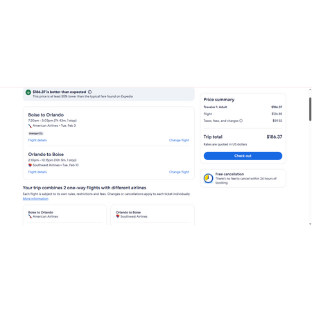 Southwest Airlines, American Airlines and Expedia have round trip airfares travelling to and from Boise ID (BOI) and Orlando FL (MCO) for $187, making 1 stop both ways. These are basic economy fares that allow a personal item and a carry-on bag. There is no seat selection and no change. If you are travelling with children on American, you will be seated together as per AA's policy.