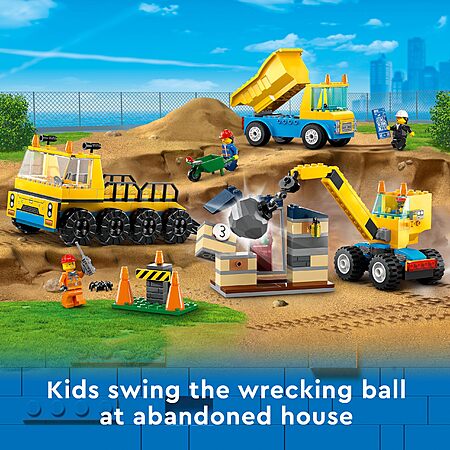 • What's in the box? – Everything kids need to build a wrecking ball crane, dump truck and abandoned house, plus 3 worker minifigures and fun accessories for pretend role play