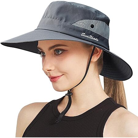 NPJY Sun Hats for Women Men 3" Wide Brim UPF 50+ Fishing Beach Bucket Hats (Grey, Ponytail Hole)